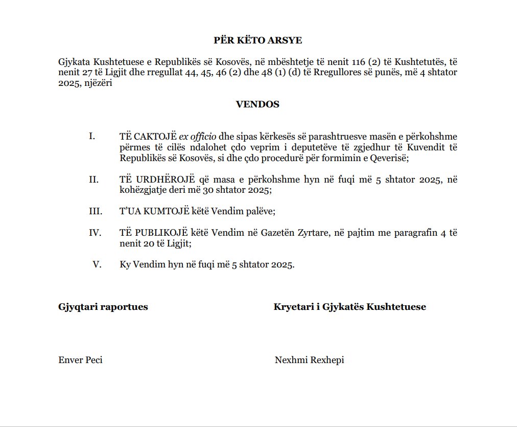“Masa hyn në fuqi më 5 shtator 2025 dhe zgjat deri më 30 shtator 2025. Vendimi do të publikohet në Gazetën Zyrtare dhe do t’u kumtohet palëve”, thuhet në vendimin e Gjykatës Kushtetuese.