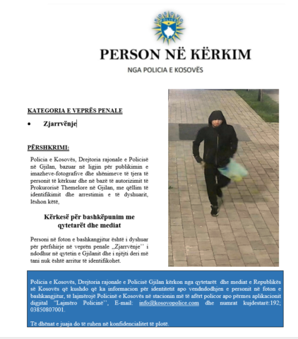 “Personi në foton e bashkangjitur është i dyshuar për përfshirje në veprën penale “Zjarrvënje’’ i ndodhur në qytetin e Gjilanit dhe i njëjti deri më tani nuk është arritur të identifikohet”, thuhet në komunikatën e policisë.