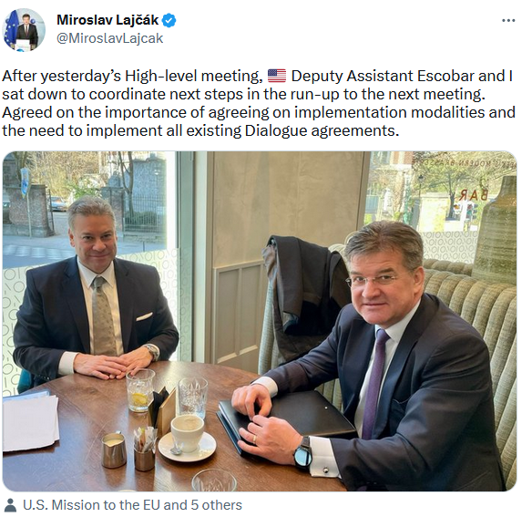 “Pas takimit të djeshëm të nivelit të lartë, sot me zëvendës sekretarin amerikan Escobar u ulëm për të koordinuar hapat e ardhshëm në prag të takimit të ardhshëm. U pajtuan për rëndësinë e marrëveshjes për modalitetet dhe nevojën për t’i zbatuar të gjitha marrëveshjet ekzistuese të dialogut”, ka shkruar Lajçak.