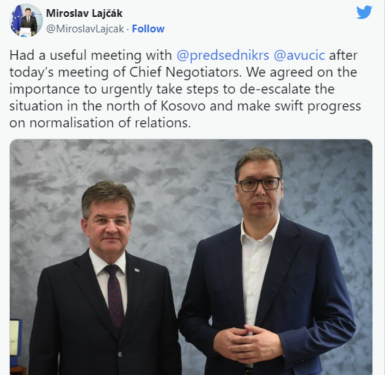 Lajçak ka bërë të ditur se me të janë dakorduar për rëndësinë që të ndërmerren hapa për depërshkallëizmin e situatës në veri të Kosovës.