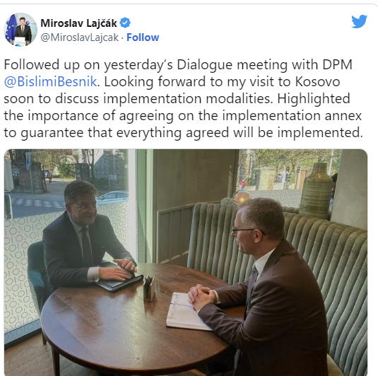 Emisari Lajçak tha se, në këtë takim, u theksua rëndësia e aneksit të marrëveshjes, që do të sigurojë zbatimin e të gjitha kërkesave në kuadër të dialogut.