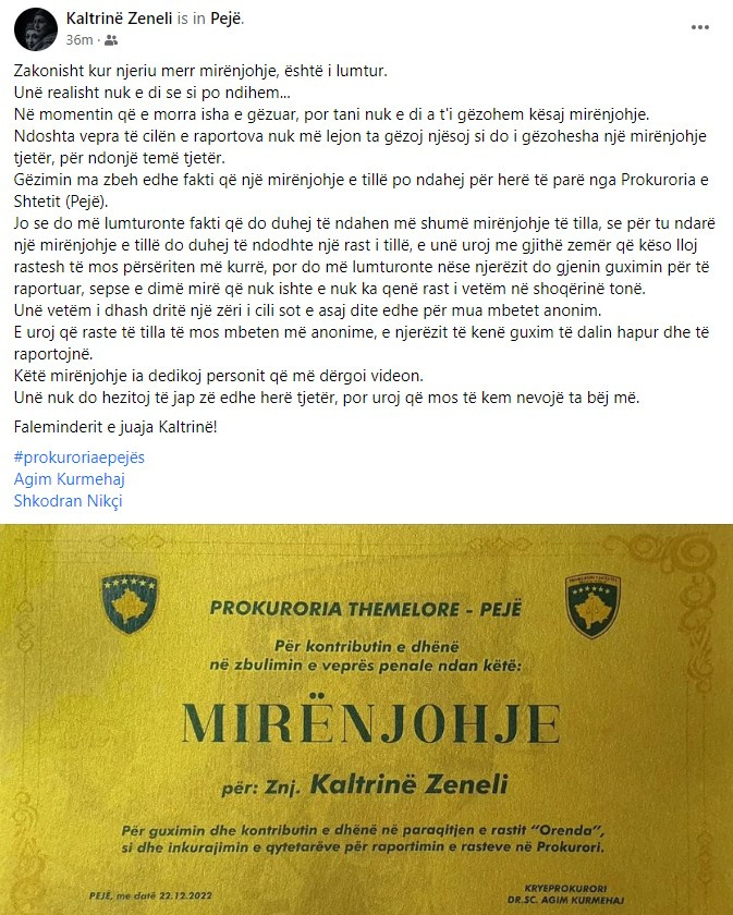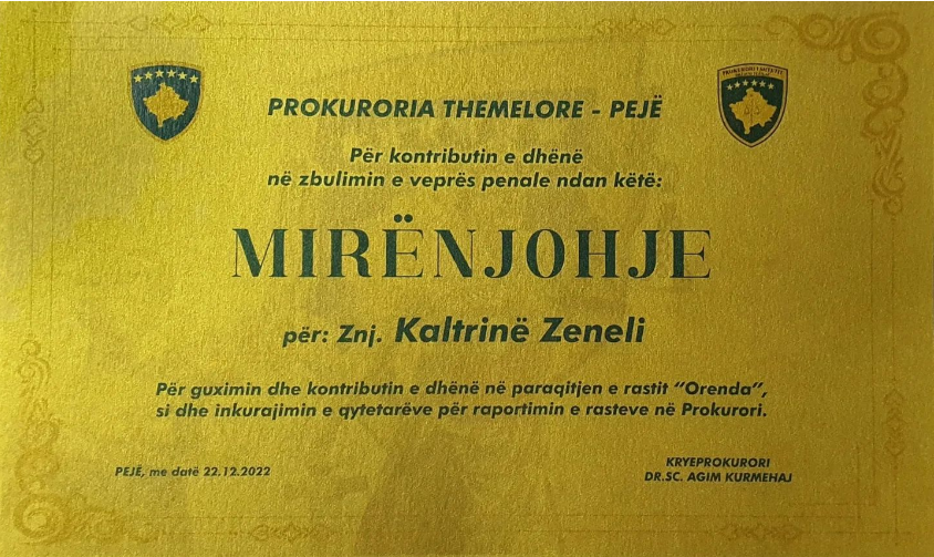 Kjo mirënjohje Zenelit i është ndarë “për guximin dhe kontributin e dhënë në paraqitjen e rastit ‘Orenda’, si dhe inkurajimin e qytetarëve për raportimin e rasteve në Prokurori”.