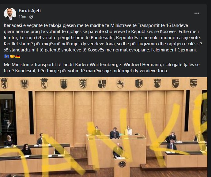 “Kënaqësi e veçantë të takoja pjesën më të madhe të Ministrave të Transportit të 16 landeve gjermane në prag të votimit të njohjes së patentë shoferëve të Republikës së Kosovës. Edhe me i lumtur, kur nga 69 votat e përgjithshme të Bundesratit, Republikës tonë nuk i mungon asnjë votë. Kjo flet shumë për miqësinë ndërmjet dy vendeve tona, si dhe për fuqizimin dhe ngritjen e cilësisë së standardizimit të patentë shoferëve të Kosovës me normat evropiane. Faleminderit Gjermani. Me Ministrin e Transportit të landit Baden-Württemberg, z. Winfried Hermann, i cili gjatë fjalës së tij në Bundesrat, bëri thirrje për votim të marrëveshjes ndërmjet dy vendeve tona”, shkroi Ajeti./arbresh.info/