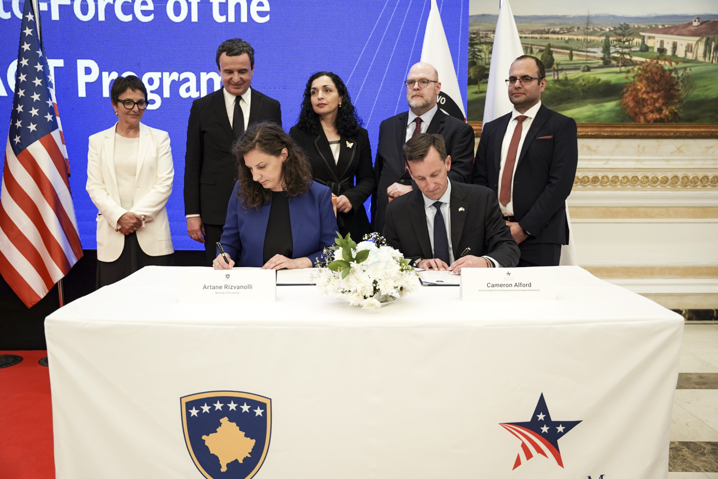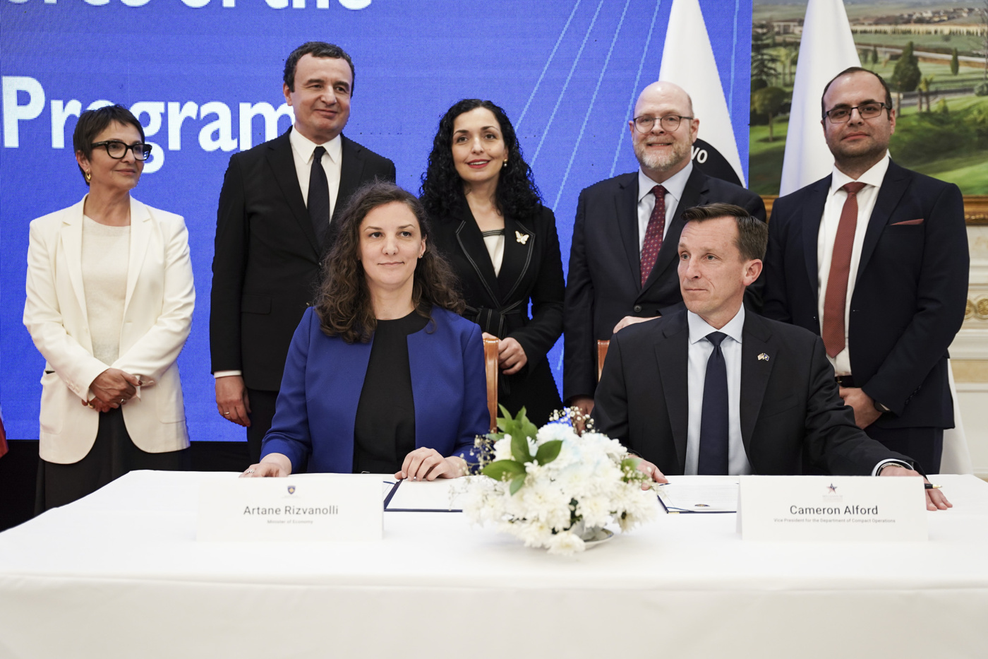 Sot, në një ngjarje ceremoniale në kryeqytetin e Kosovës, Ministrja e Ekonomisë, Artane Rizvanolli dhe Zëvendëspresidenti i Operacioneve Kompakt në Korporatën Amerikane të Sfidës së Mijëvjeçarit (MCC) Cameron Alford, nënshkruan marrëveshjen e hyrjes në fuqi./Arbresh.info