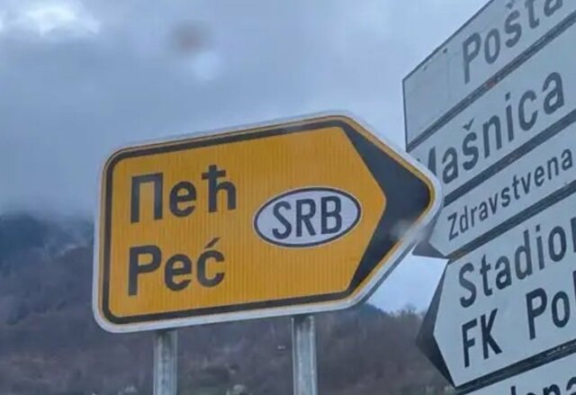 Një tabelë e vendosur në Plavë, e cila i referohej Pejës si pjesë e Serbisë.