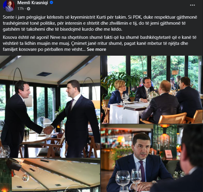 Për takimin me kryeministrin, Albin Kurti kryetari i PDK-së, Memli Krasniqi ka reaguar edhe përmes një postimi në Facebook.