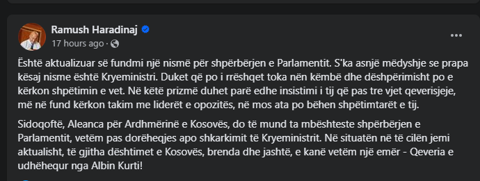 “Është aktualizuar së fundmi një nismë për shpërbërjen e Parlamentit. S’ka asnjë mëdyshje se prapa kësaj nisme është Kryeministri. Duket që po i rrëshqet toka nën këmbë dhe dëshpërimisht po e kërkon shpëtimin e vet. Në këtë prizmë duhet parë edhe insistimi i tij që pas tre vjet qeverisjeje, më në fund kërkon takim me liderët e opozitës, në mos ata po bëhen shpëtimtarët e tij.”, ka shkruar Haradinaj në llogarinë e tij në Facebook.