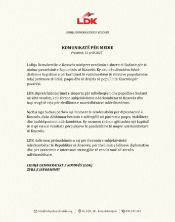 “LDK shpreh falënderimet e sinqerta për udhëheqësit dhe popullin e Sudanit në këtë vendim, i cili forcon subjektivitetin ndërkombëtar të Kosovës dhe hap rrugë të reja për zhvillimin e marrëdhënieve ndërshtetërore.