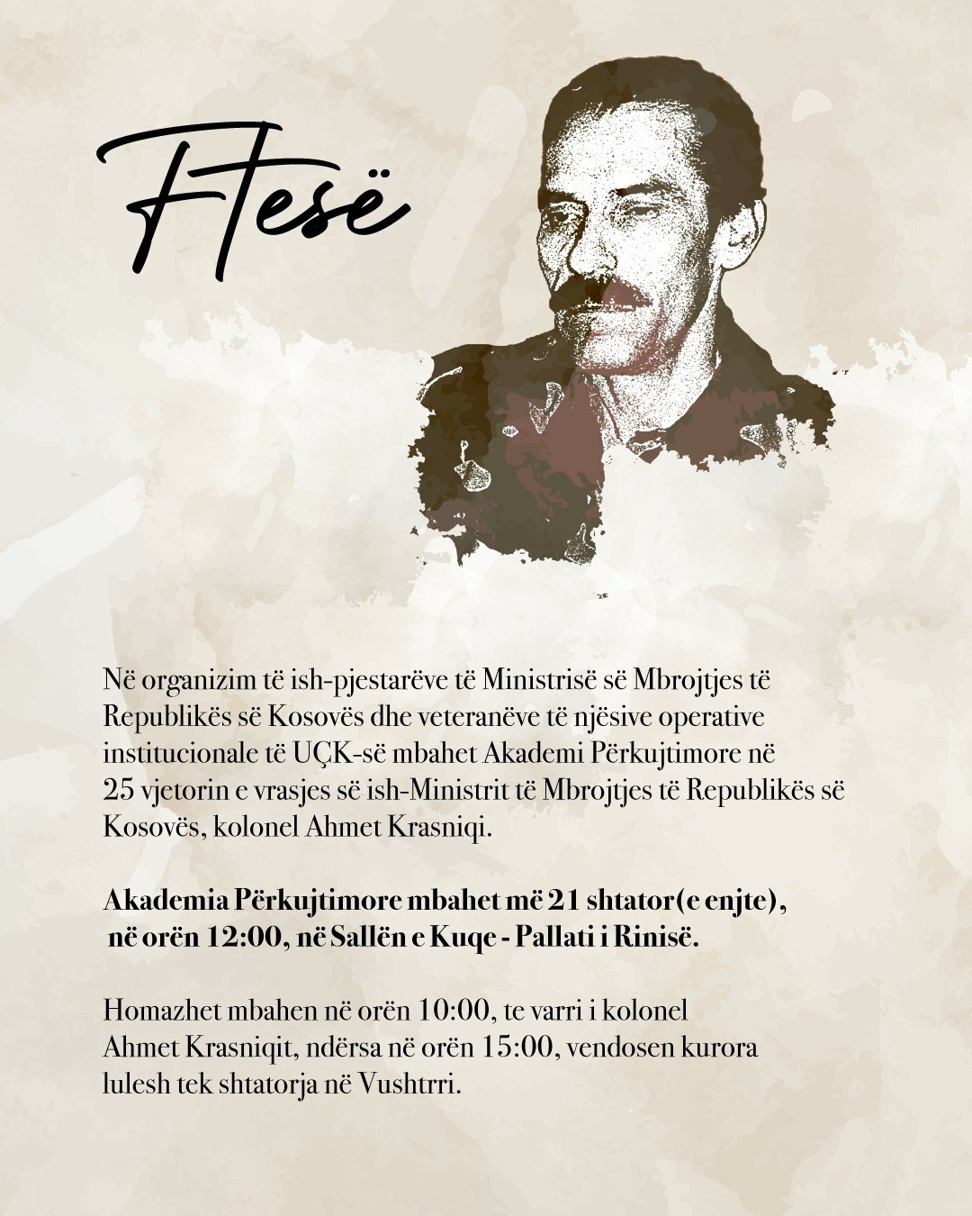 Lidhja Demokratike e Kosovës mban sot akademi përkujtimore për Kolonel Ahmet Krasniqin.