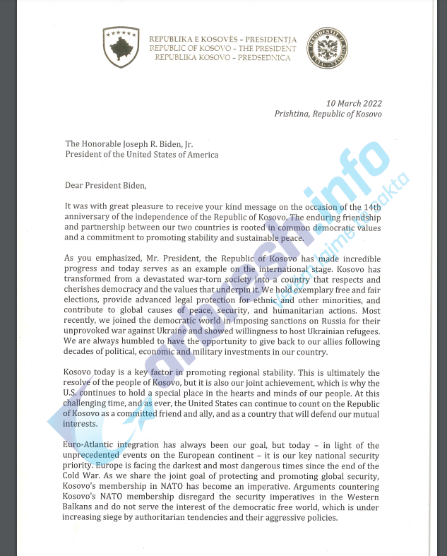 Në letër Osmani thotë se si presidente e Kosovës, e di që SHBA, politika e jashtme dhe interesat nacionale janë për një Evropë të lirë dhe në paqe dhe integrimi i Ballkanit Perëndimor është krucial në këtë drejtim, raporton arbresh.info