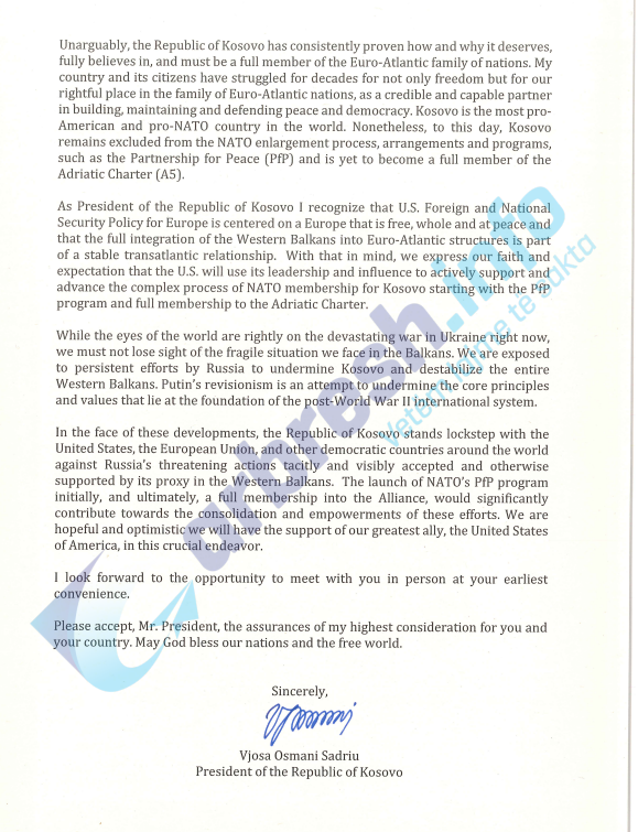 “Duke pas parasysh këtë ne shprehim besimin tonë që SHBA-të do të përdor lidershipin dhe ndikimin e saj që aktivisht të ndihmojë dhe shtyjë para anëtarësimin e Kosovës në mekanizmat e NATO-s”, thuhet në letër./arbresh.info/