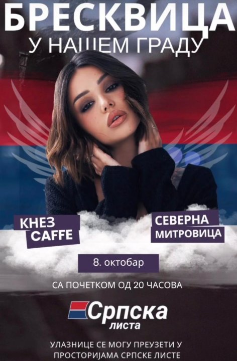 Ngjarja organizohet me logon zyrtare të Listës Serbe, e cila në mënyrë të qartë e identifikon këtë event si pjesë të agjendës së saj politike: “Breskvica në qytetin tonë – 8 tetor, ora 20:00, Knez Caffe, Mitrovicë e Veriut”“Biletat mund të merren në zyrat e Listës Serbe.”