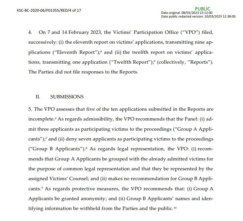“Sipas Urdhrit të Mbrojtjes së Viktimave pesë nga dhjetë aplikacionet e paraqitura në raporte janë të paplota, 6 Për sa i përket pranueshmërisë. Rekomandohet që Paneli t’i pranojë tre aplikantë si viktima pjesëmarrëse në procedurë dhe t’i anulojë shtatë aplikantë si viktima pjesëmarrëse në procedurë”, thuhet në njoftim ndër të tjera.