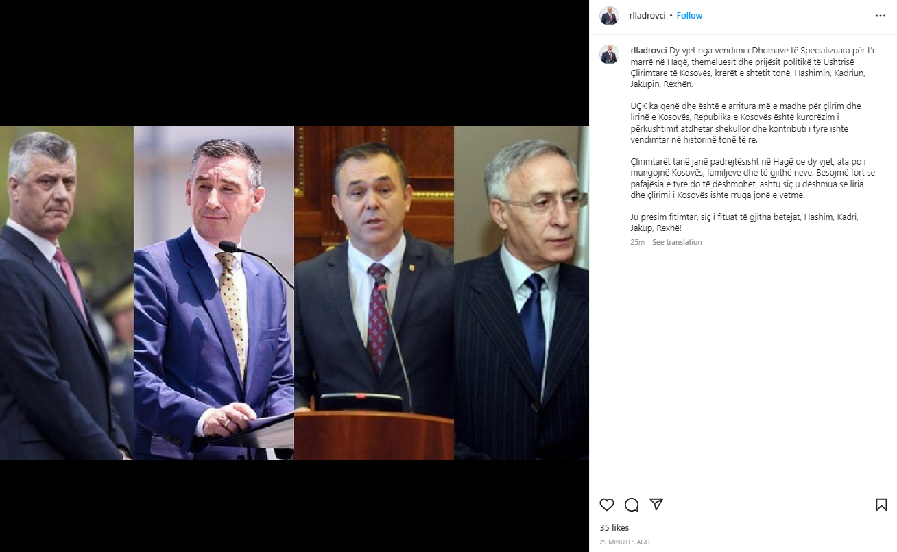 Lladrovci ka shkruar se „Çlirimtarët tanë janë padrejtësisht në Hagë qe dy vjet, ata po i mungojnë Kosovës, familjeve dhe të gjithë neve. Besojmë fort se pafajësia e tyre do të dëshmohet, ashtu siç u dëshmua se liria dhe çlirimi i Kosovës ishte rruga jonë e vetme”.