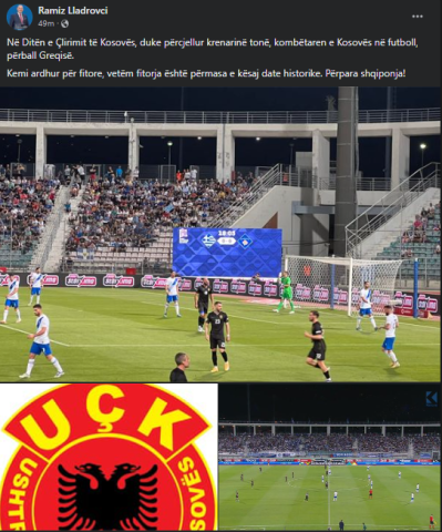 Kryetari i Drenasit, Ramiz Lladrovci, nga stadiumi grek ku po luhet loja Kosovë-Greqi, ka postuar stemën e UÇK-së dhe foto nga loja, me përgëzimin: Përpara shqiponja.