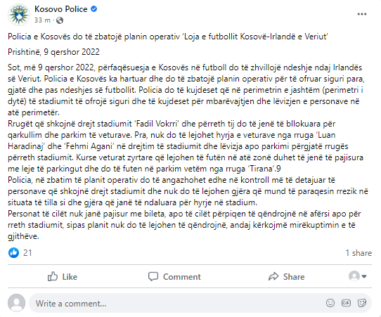 Sot, më 9 qershor 2022, përfaqësuesja e Kosovës në futboll do të zhvillojë ndeshje ndaj Irlandës së Veriut. Policia e Kosovës ka hartuar dhe do të zbatojë planin operativ për të ofruar siguri para, gjatë dhe pas ndeshjes së futbollit.