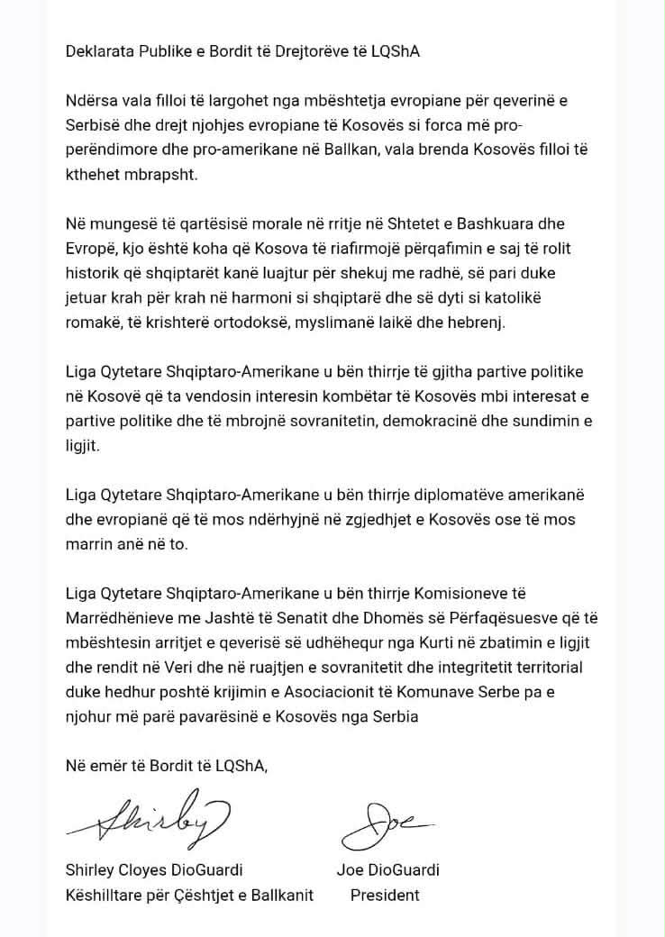 Deklarata është nënshkruar në emër të Bordit të LQShA-së nga Shirley Cloyes Dioguardi, këshilltare për Çështjet e Ballkanit, dhe Joe DioGuardi, president i organizatës.