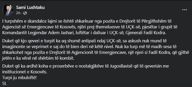 “I turpshëm e skandaloz lajmi se është shkarkuar nga pozita e Drejtorit të Përgjithshëm të Agjencisë së Emergjencave të Kosovës, njëri prej themeluesve të UÇK-së, pjesëtar i grupit të Komandantit Legjendar Adem Jashari, luftëtar i dalluar i UÇK-së, Gjenerali Fadil Kodra”, ka shkruar ai.