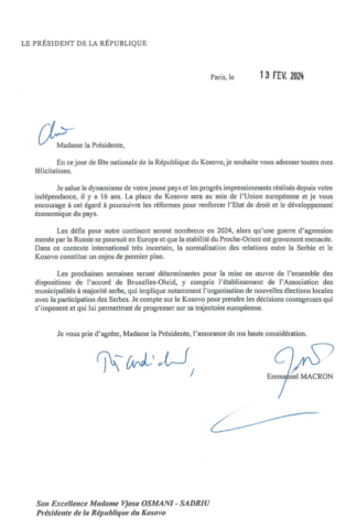 Presidentja e Republikës së Kosovës, Vjosa Osmani, me rastin e 16 vjetorit të Pavarësisë së Republikës së Kosovës, ka pranuar letër urimi nga Presidenti i Republikës Franceze, Emmanuel Macron.
