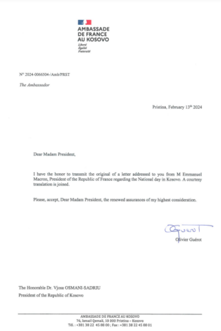 Presidentja e Republikës së Kosovës, Vjosa Osmani, me rastin e 16 vjetorit të Pavarësisë së Republikës së Kosovës, ka pranuar letër urimi nga Presidenti i Republikës Franceze, Emmanuel Macron.