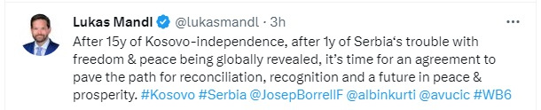 “Pas 15 vjetësh të pavarësisë së Kosovës, pas një viti të telasheve të Serbisë me lirinë dhe paqen, që u zbuluan globalisht, është koha për një marrëveshje që të hapë rrugën për pajtim, njohje dhe një të ardhme në paqe dhe prosperitet”, ka shkruar Mandel.