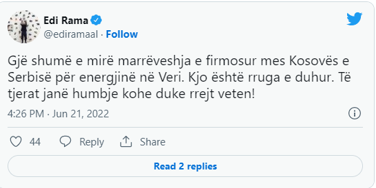 Përmes një postimi në Twitter, Rama shkruan se kjo është rruga e duhur, ndërsa të tjerat janë humbje kohë ‘duke e rrejt veten’, shkruan arbresh.info.