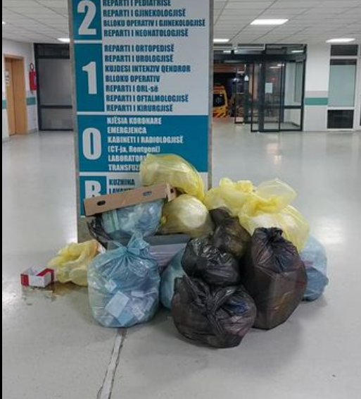 Një qytetar ka raportuar se thasët e mbushura me mbeturina medicionale të spitalit janë duke qëndruar në korridore, për shkak se punëtorët që përkujdesen për pastërtinë e këtij objekti janë në protestë për rritjen e pagave.