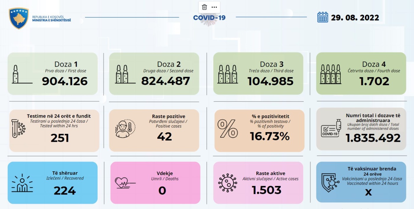 Në 24 orët e fundit nuk është shënuar asnjë vdekje ndërsa janë regjistruar 42 raste të reja.