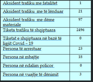Gjatë kësaj kohe, kanë ndodhur 97 aksidente trafiku me dëme materiale, 21 me të lënduar e një me fatalitet, shkruan Arbresh.info.