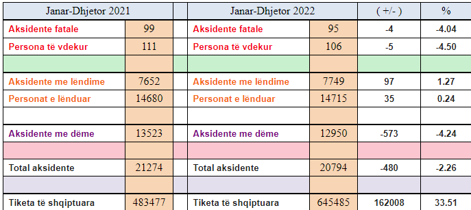 Në bazë të raportit të Policisë së Kosovës bëhet e ditur se gjatë vitit 2022 ka pasur më pak aksidente fatale, krahasuar me aksidentet që kanë ndodhur në vitin 2021.