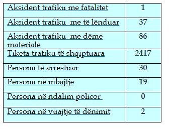 Gjatë kësaj kohe, kanë ndodhur 86 aksidente trafiku me dëme materiale, 37 me të lënduar e një me fatalitet, shkruan Arbresh.info.