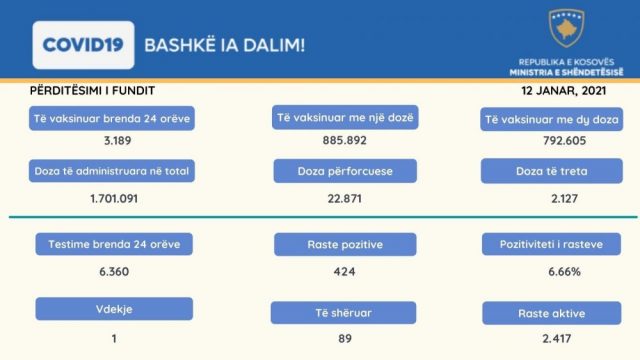 “Ministria e Shëndetësisë, sipas të dhënave nga Instituti Kombëtar i Shëndetësisë Publike të Kosovës, informon: Në 24 orët e fundit janë dhënë 3.189 doza të vaksinës kundër COVID-19. Prej fillimit të vaksinimit në të gjitha qytetet e Kosovës janë dhënë 1.701.091 doza të vaksinës. Deri më sot 792.605 qytetarë janë vaksinuar me dozën e dytë. Deri më sot janë dhënë 22.871 doza përforcuese dhe 2.127 doza të treta të vaksinës kundër COVID-19″, është bërë e ditur nga Ministria e Shëndetësisë./arbresh.info/