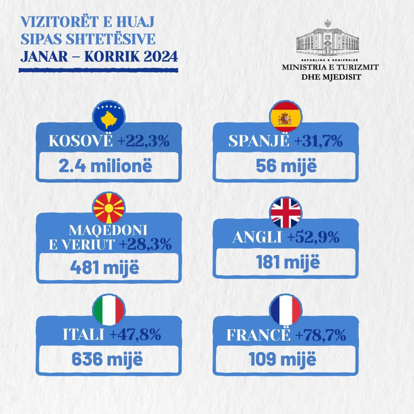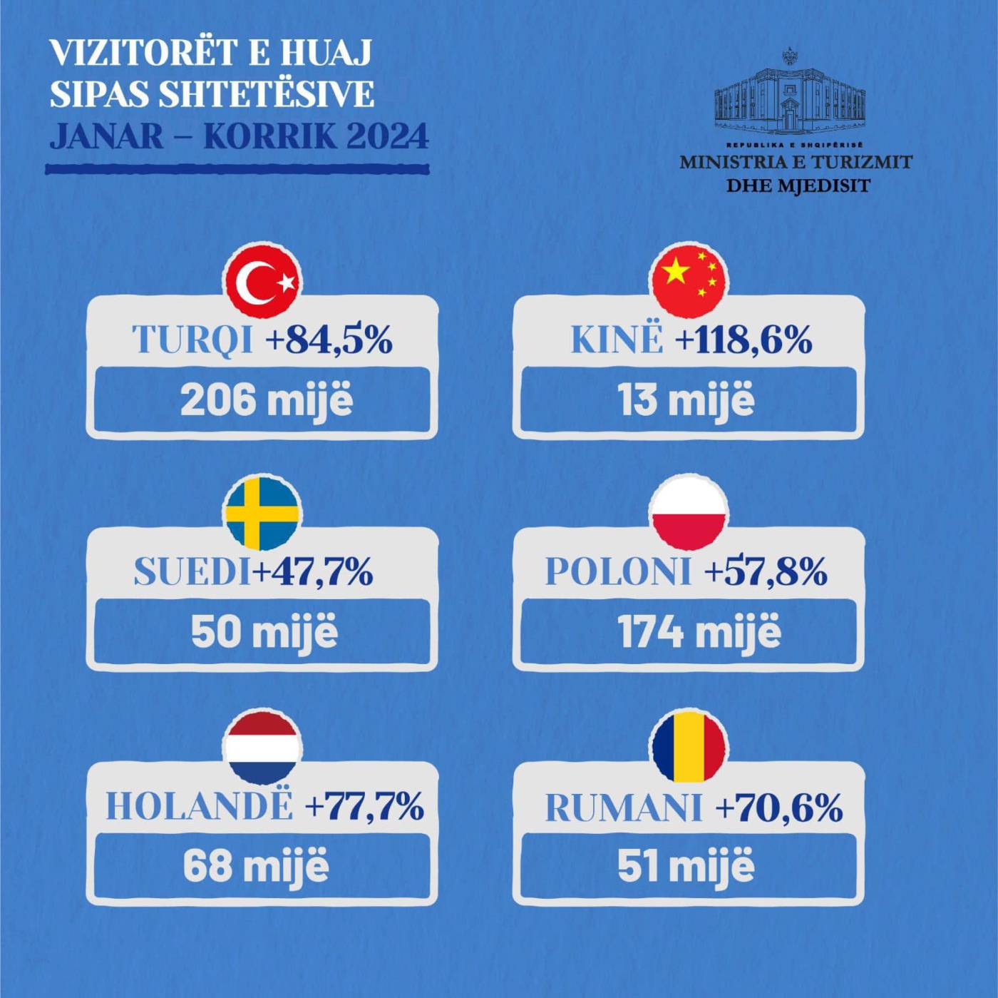 Në këto statistika prijnë qytetarët nga Kosova me 23 për qind rritje, pasuar me turist nga Spanja, Maqedonia e Veriut, Anglia, Italia, Franca etj.