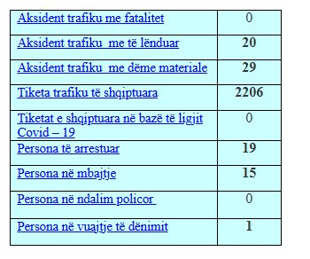 Sipas raportit ditor të Policisë, një nga aksidentet ka përfunduar me fatalitet, ndërsa 20 aksidente kanë rezultuar me persona të lënduar dhe 29 të tjera vetëm me dëme materiale.