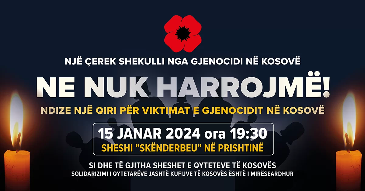 Me rastin e Ditës së Përkujtimit të Gjenocidit në Kosovë, Qendra „Gjenocidi në Kosovë – Plagë e Hapur“ fton të gjithë shqiptarët që më 15 janar 2024 duke filluar nga ora 19:30 të bëjnë ndezjen e qirinjve në shenjë përkujtimi për viktimat e gjenocidit në Kosovë.