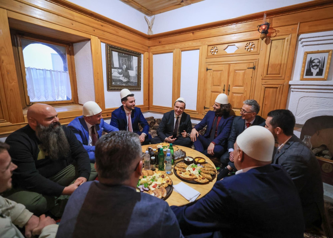 Me plis në kokë e i ulur në një sofër, kryeministri Albin Kurti ka shijuar drekën e së dielës në Kullën “Oda e Junikut”
