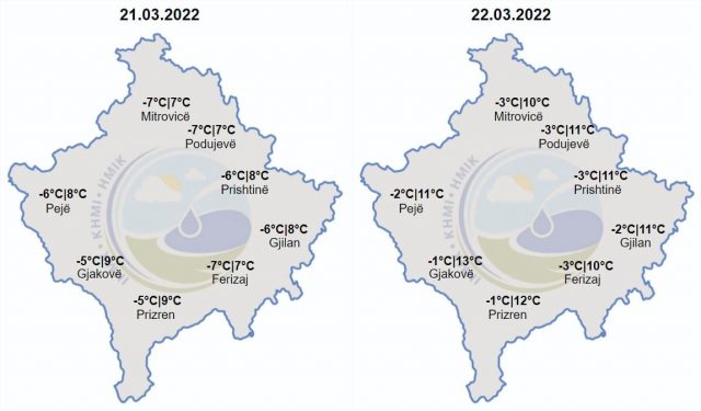 Temperaturat në shkallë vendi do të lëvizin ndërmjet -7 deri 2 gradë Celsius, minimalet, ndërsa maksimalet e ditës parashihen të lëvizin ndërmjet 8-19 gradë Celsius. Do të fryjë erë kryesisht nga verilindja, por në intervale të shkurta edhe nga juglindja me shpejtësi 1-6 m/s. /arbresh.info/
