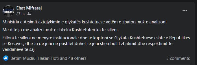 Miftaraj ka thënë se Ministria e Arsimit nuk duhet ta analizojë aktgjykimin e Gjykatës Kushtetuese, por duhet ta zbatojë atë. Madje ai iu drejtu Nagavcit duke i thënë se “me dit ju me analizu, nuk e shkelni Kushtetutën ka të silleni”.