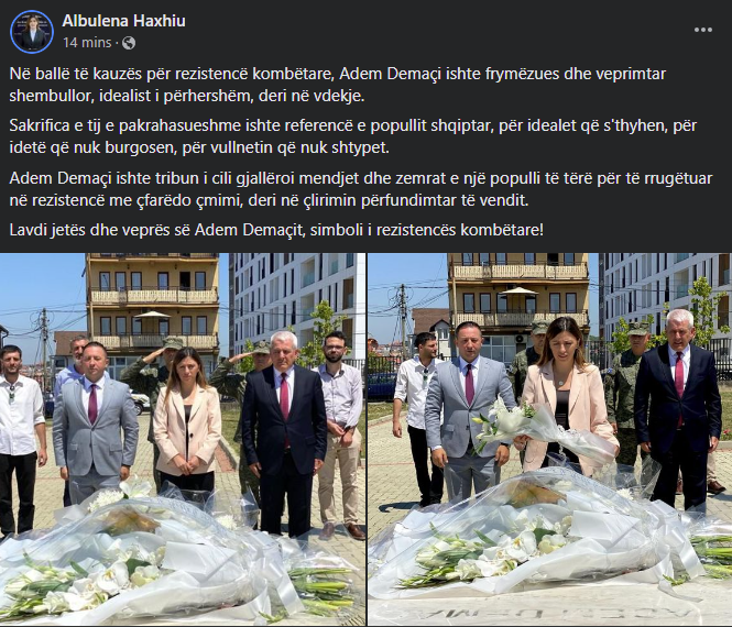 Lavdi jetës dhe veprës së Adem Demaçit, simboli i rezistencës kombëtare”, ka shkruar ministrja Haxhiu në facebook. /arbresh.info/