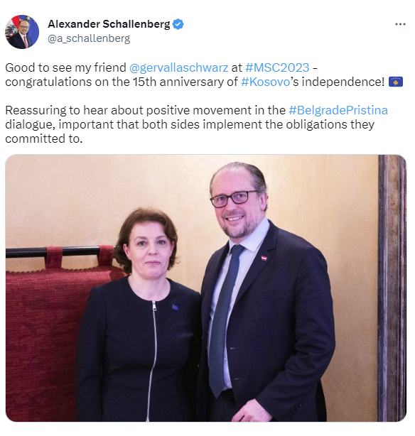 “Më vjen mirë që takova mikeshën time, Donika Gërvalla në Konferencën për Siguri në Mynih – urime për 15 vjetorin e pavarësisë së Kosovës. Po sigurohem që të dëgjojë veprime pozitive në dialogun Beograd-Prishtinë, e rëndësishme që të dyja palët të zbatojnë detyrimet për të cilat u zotuan”, ka shkruar kryediplomati austriak. /arbresh.info/