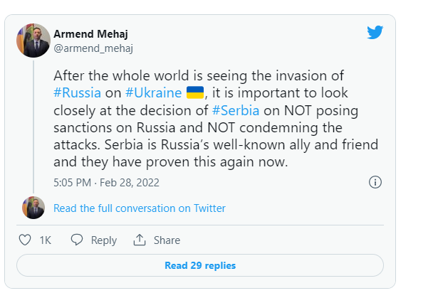 “Pasi e gjithë bota po sheh pushtimin e Rusisë në Ukrainë, është e rëndësishme të shikojmë nga afër vendimin e Serbisë për të mos vendosur sanksione ndaj Rusisë dhe për të mos dënuar sulmet. Serbia është aleati dhe mikja e njohur e Rusisë dhe këtë e kanë dëshmuar sërish tani”, ka shkruar Mehaj./arbresh.info/