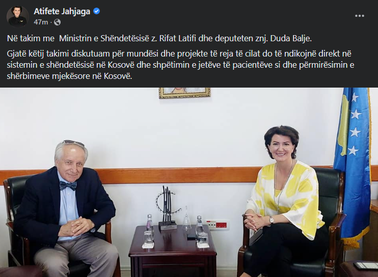 Ministri i Shëndetësisë në Qeverinë e Kosovës, Rifat Latifi, sot ka zhvilluar një takim me ish-presidenten, Atifete Jahjaga dhe deputeten Duda Balje.
