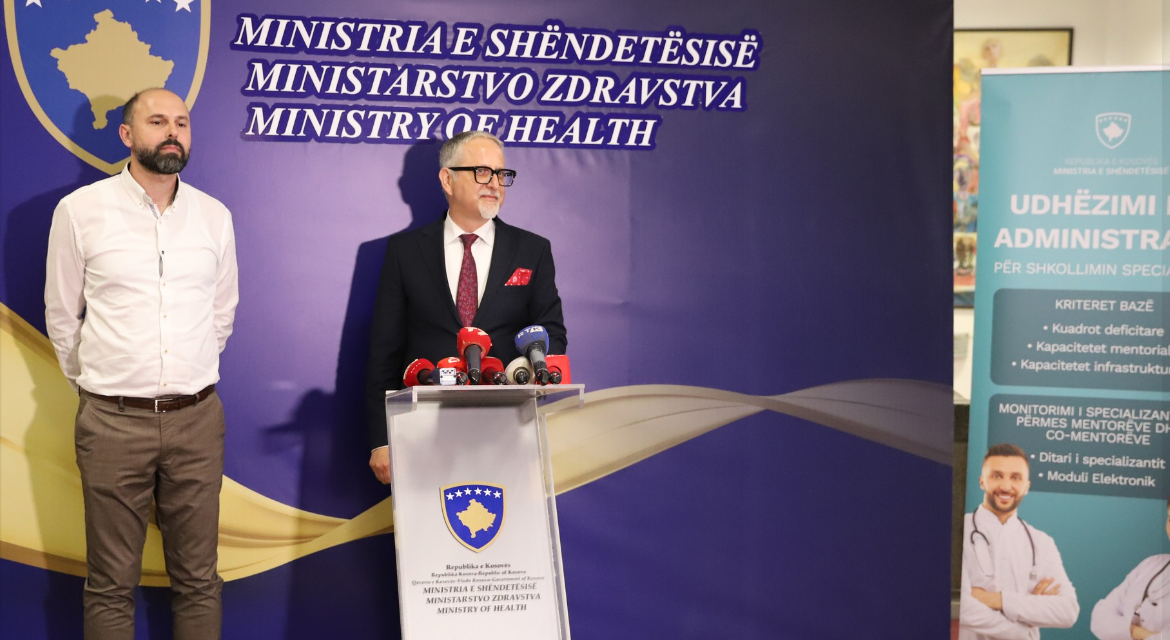 Ministri i Shëndetësisë, Dr. Arben Vitia, sot në një konferencë për media, bashkë me drejtuesin e Bordit për Shkollim Specialistik, dr. Edmond Haliti, prezantuan hapjen e konkursit për shkollimin specialistik, bazuar në Udhëzimin e ri Administrativ (UA) Nr. 01/2023 për shkollim specialstik.