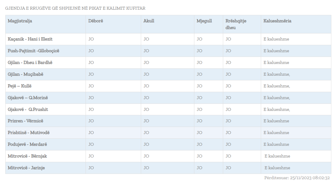 Sipas të dhënave të publikuar nga kjo qendër, magjistralet që shpien në kufi, janë të kalueshme, nuk raportohet për borë, akull, mjegull apo rrëshqitje dheu.