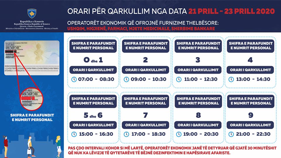 Ministria e Shëndetësisë ka publikuar orarin e ri të qarkullimit të qytetarëve në Kosovë, në kohën me pandemi koronavirus.