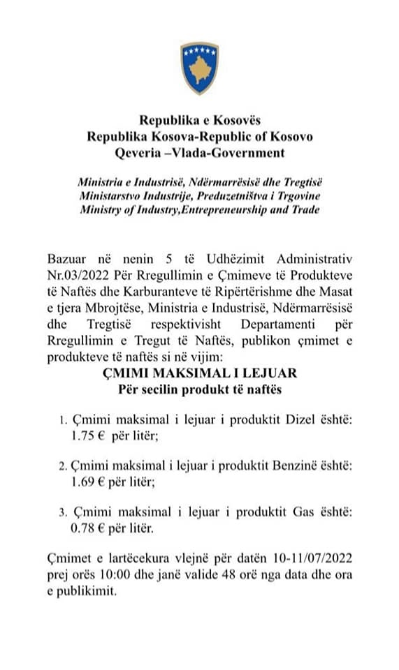 Ministria e Industrisë, Ndërmarrësisë dhe Tregtisë ka publikuar çmimet e derivateve që vlejnë për 24 orët e ardhshme.