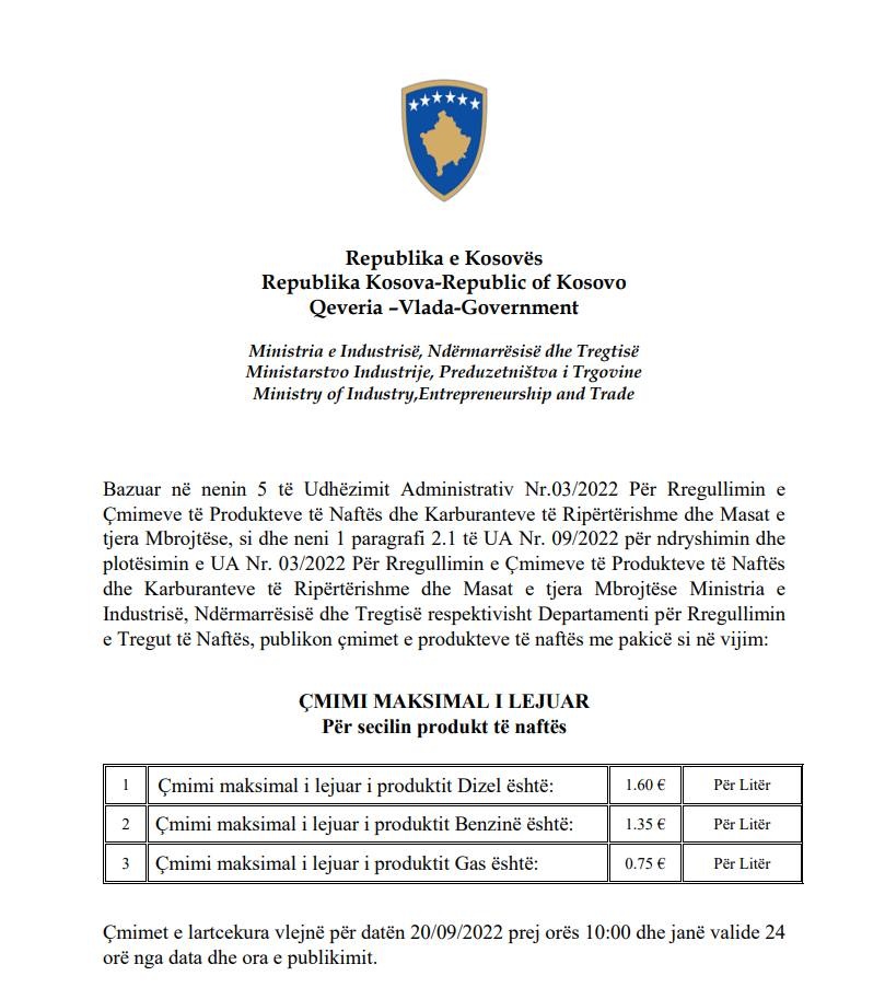 Ministria e Industrisë, Ndërmarrësisë dhe Tregtisë ka njoftuar për vendosjen e çmimit tavan në produktet e derivateve.