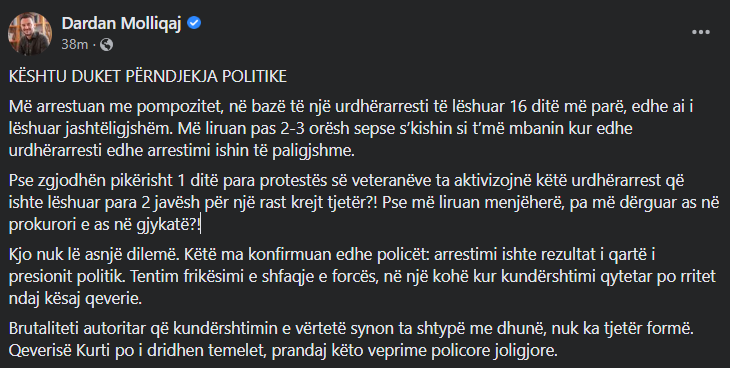 “Kjo nuk lë asnjë dilemë. Këtë ma konfirmuan edhe policët: arrestimi ishte rezultat i qartë i presionit politik. Tentim frikësimi e shfaqje e forcës, në një kohë kur kundërshtimi qytetar po rritet ndaj kësaj qeverie”, ka shkruar Molliqaj në një postim në Facebook.