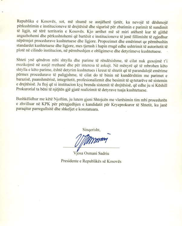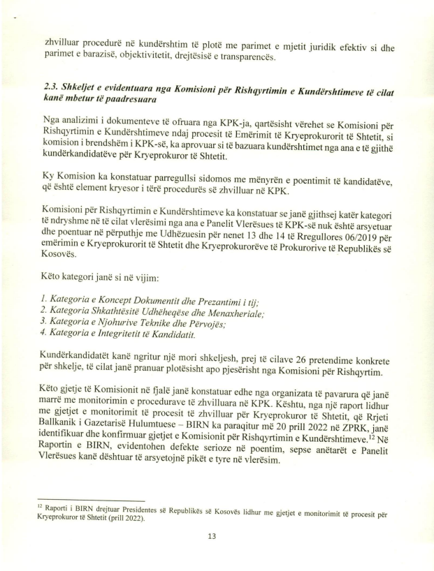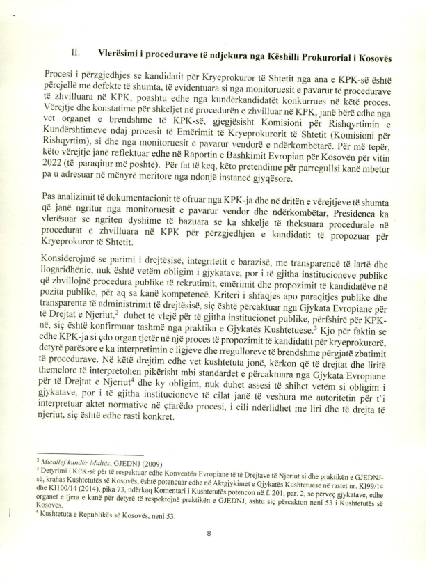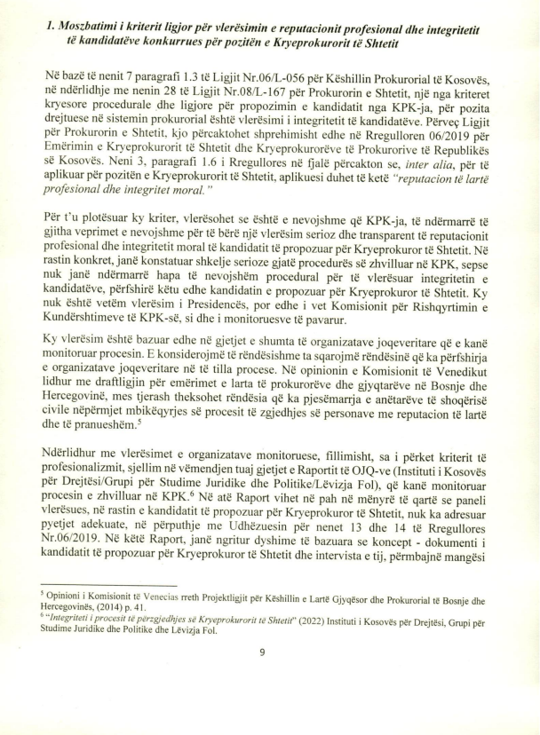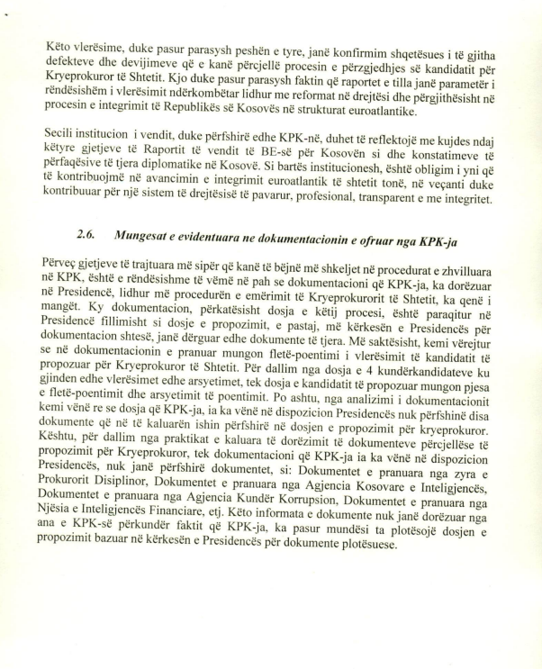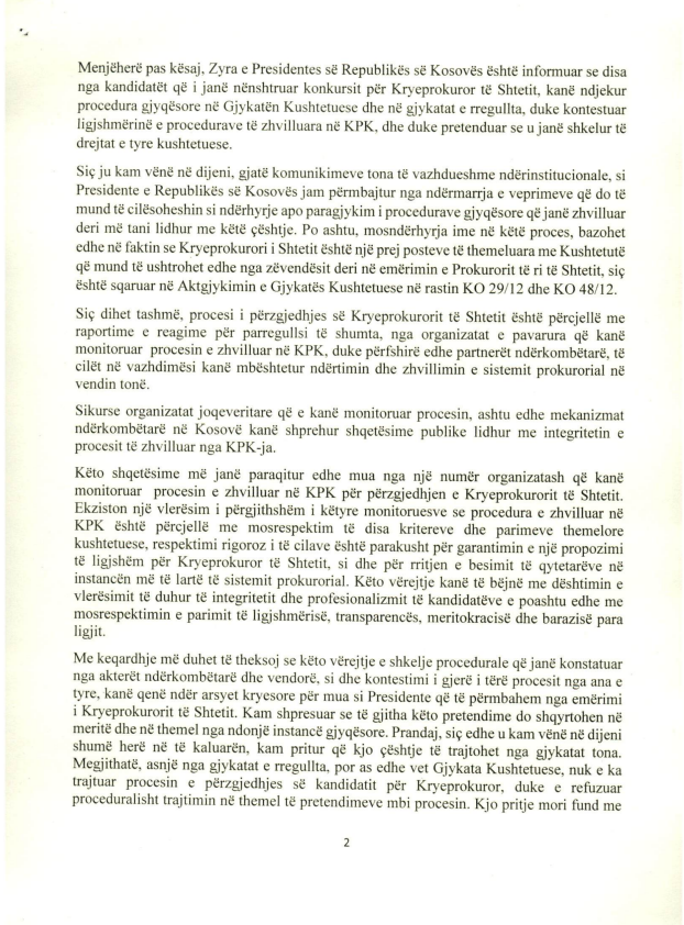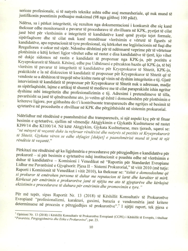 “Sikurse organizatat joqeveritare që e kanë monitoruar procesin, ashtu edhe mekanizmat ndërkombëtarë në Kosovë kanë shprehur shqetësime publike lidhur me integritetin e procesit të zhvilluar nga KPK-ja. Këto shqetësime më janë paraqitur edhe mua nga një numër organizatash që kanë monitoruar procesin e zhvilluar në KPK për përzgjedhjen e Kryeprokurorit të Shtetit. Ekziston një vlerësim i përgjithshëm i këtyre monitoruesve se procedura e zhvilluar në KPK është përcjellë me mosrespektim të disa kritereve dhe parimeve themelore kushtetuese, respektimi rigoroz i të cilave është parakusht për garantimin e një propozimi të ligjshëm për Kryeprokuror të Shtetit, si dhe për rritjen e besimit të qytetarëve në instancën më të lartë të sistemit prokurorial. Këto vërejtje kanë të bëjnë me dështimin e vlerësimit të duhur të integritetit dhe profesionalizmit të kandidatëve e po ashtu edhe me mosrespektimin e parimit të ligjshmërisë, transparencës, meritokracisë dhe barazisë para ligjit”, thuhet në dokument.