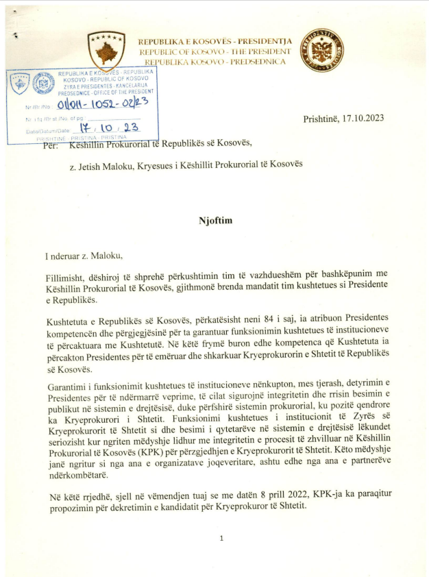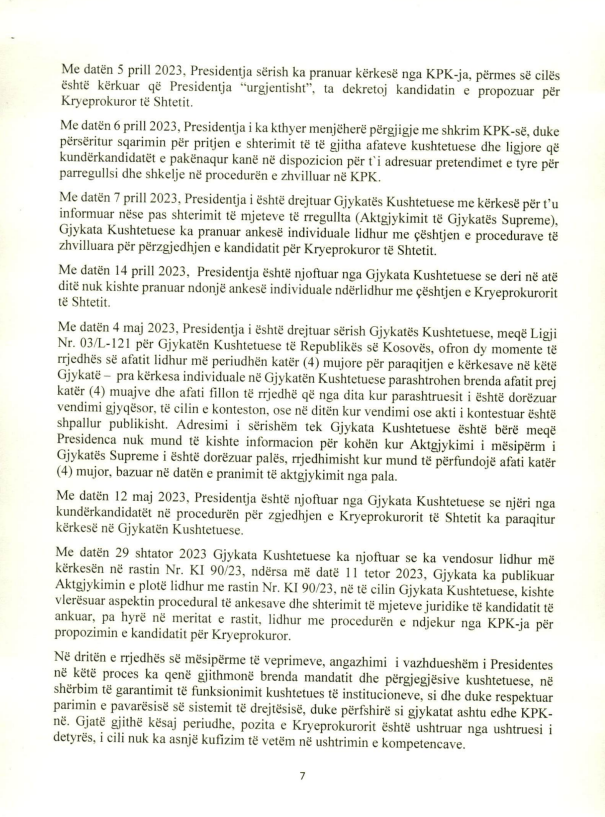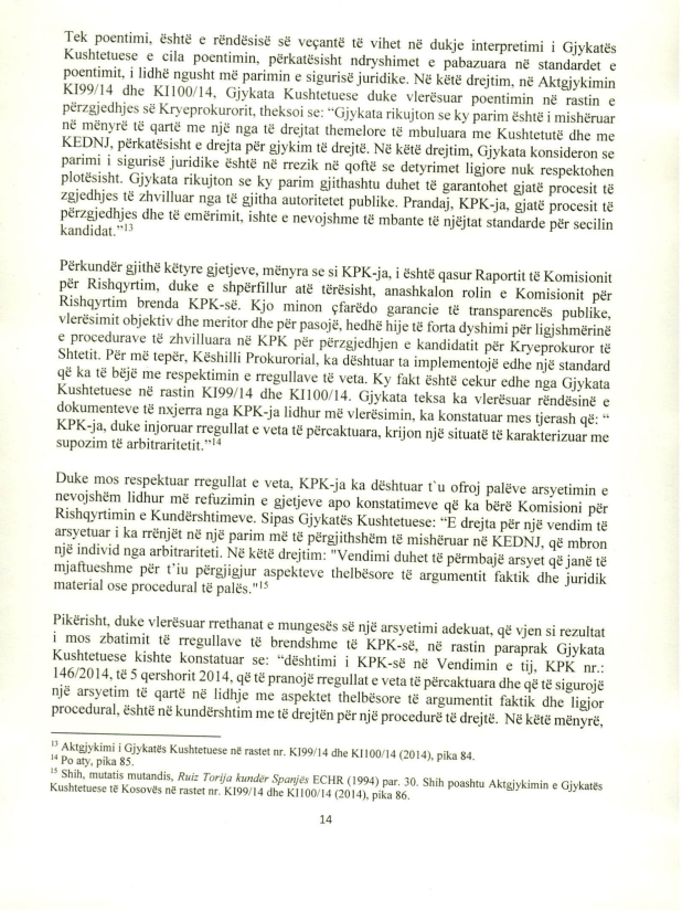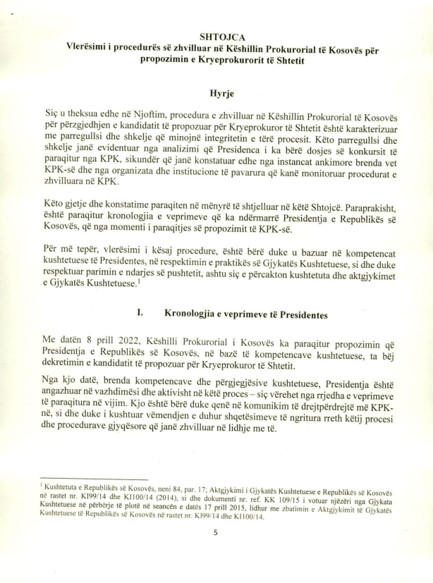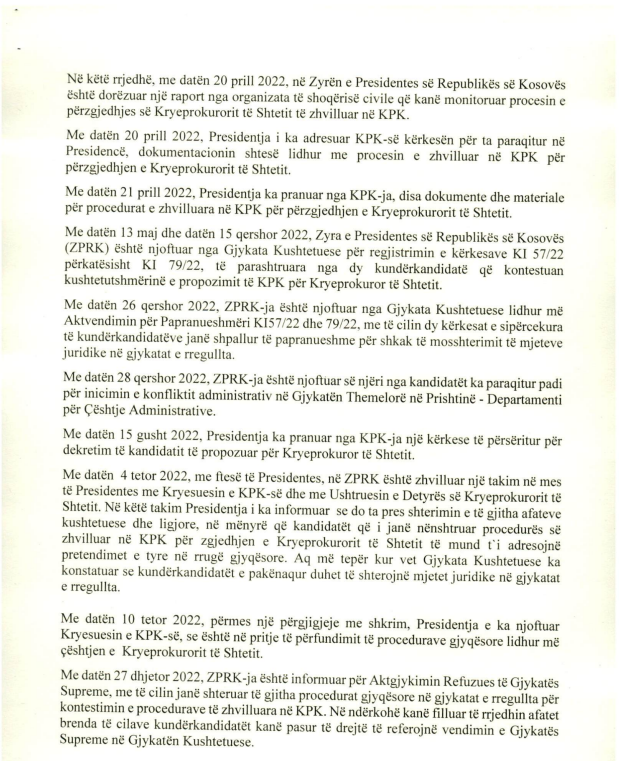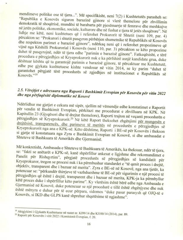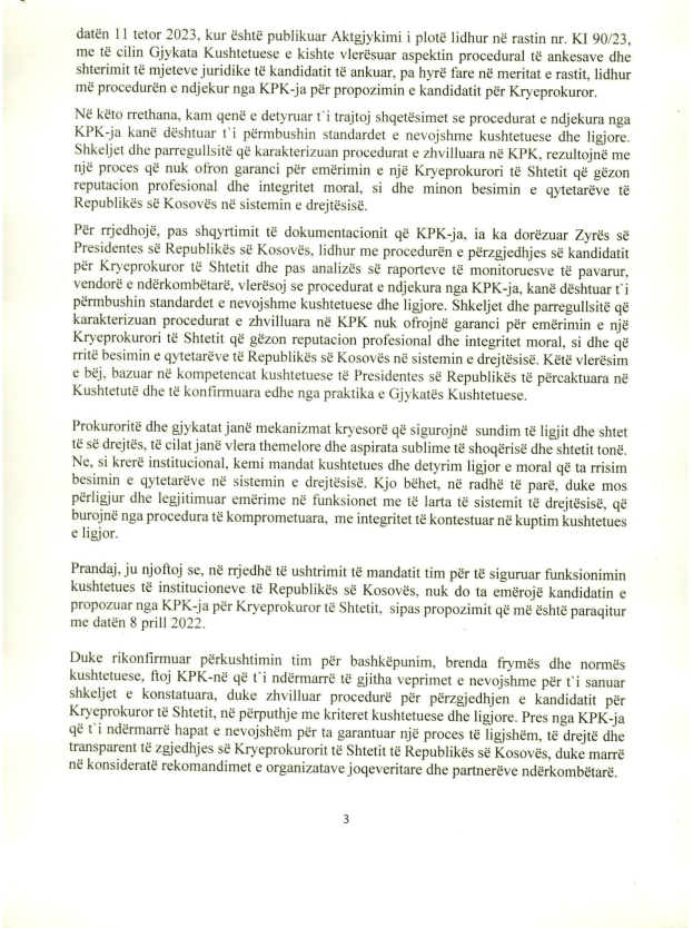 “Sikurse organizatat joqeveritare që e kanë monitoruar procesin, ashtu edhe mekanizmat ndërkombëtarë në Kosovë kanë shprehur shqetësime publike lidhur me integritetin e procesit të zhvilluar nga KPK-ja. Këto shqetësime më janë paraqitur edhe mua nga një numër organizatash që kanë monitoruar procesin e zhvilluar në KPK për përzgjedhjen e Kryeprokurorit të Shtetit. Ekziston një vlerësim i përgjithshëm i këtyre monitoruesve se procedura e zhvilluar në KPK është përcjellë me mosrespektim të disa kritereve dhe parimeve themelore kushtetuese, respektimi rigoroz i të cilave është parakusht për garantimin e një propozimi të ligjshëm për Kryeprokuror të Shtetit, si dhe për rritjen e besimit të qytetarëve në instancën më të lartë të sistemit prokurorial. Këto vërejtje kanë të bëjnë me dështimin e vlerësimit të duhur të integritetit dhe profesionalizmit të kandidatëve e po ashtu edhe me mosrespektimin e parimit të ligjshmërisë, transparencës, meritokracisë dhe barazisë para ligjit”, thuhet në dokument.